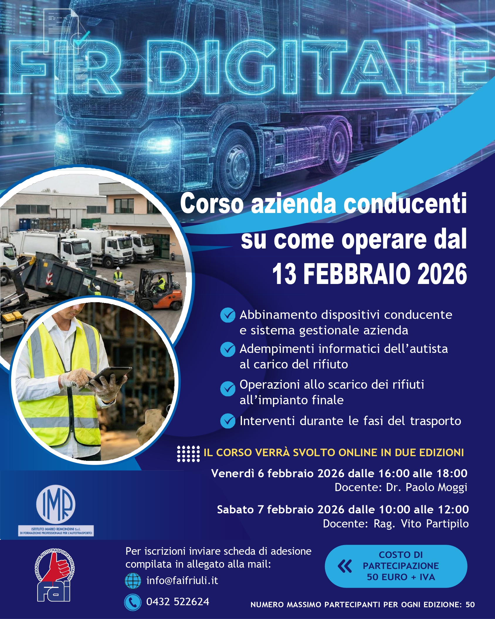 Si comunicano le prossime due edizioni in riferimento al “FIR DIGITALE: Corso Azienda Conducente su come operare dal 13 febbraio 2026”: